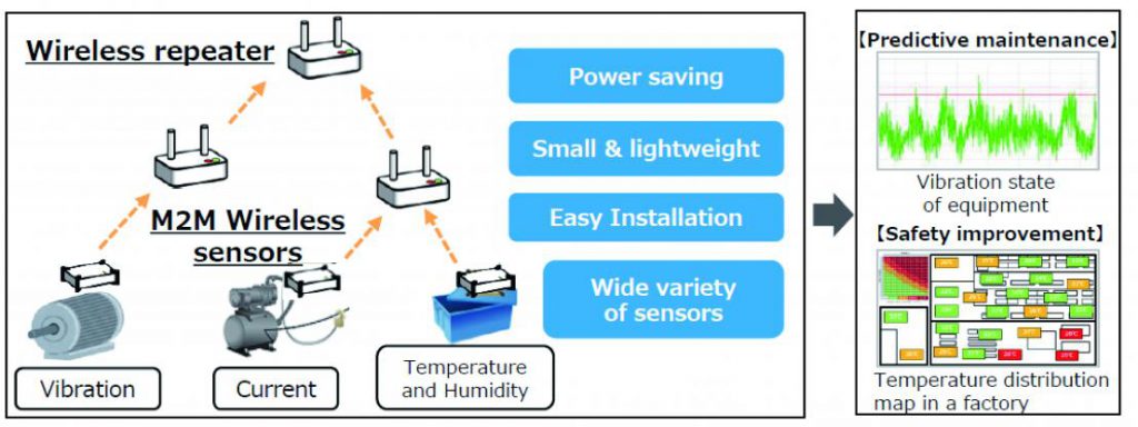We develop battery-driven M2M wireless sensor to collect equipment data easily. The collected data is visualized by the IoT/AI platform system and can be used for various manufacturing improvements.