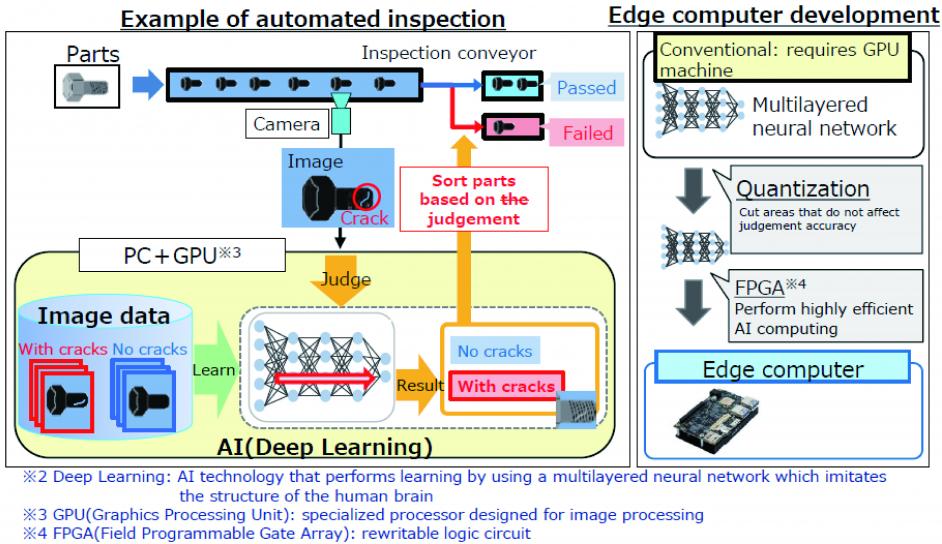 In many inspection processes, securing and developing human resources that perform visual inspection has been emerging as an issue. For that reason, we are working on automation of inspection processes using AI technology (Deep Learning *2). In addition, we are developing edge computers to reduce the cost and size of automated inspection systems.